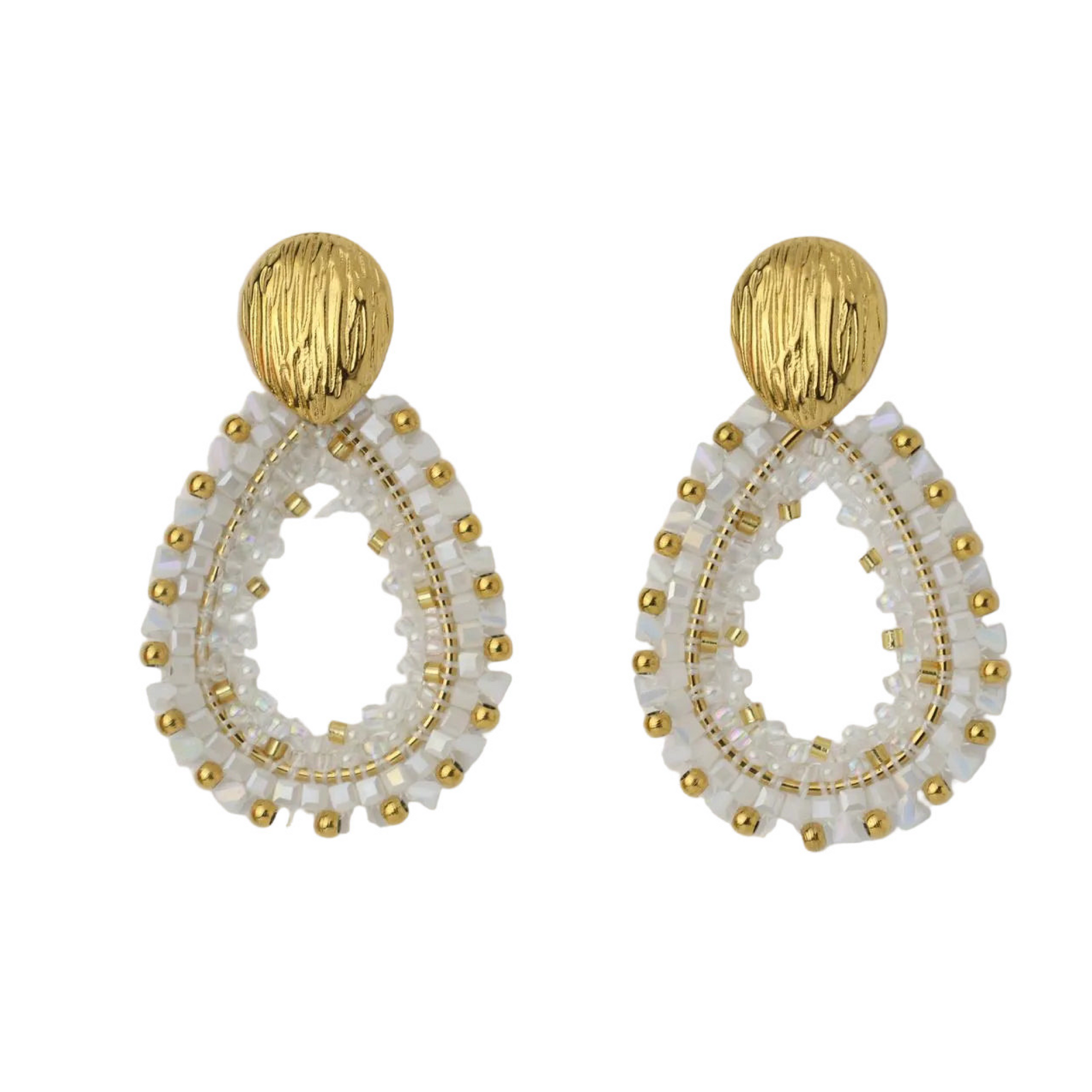 Diese ausdrucksstarken Ohrringe vereinen moderne Eleganz mit handwerklicher Raffinesse. Der strukturierte, goldfarbene Stecker setzt ein klares Statement, während der tropfenförmige Anhänger mit fein gearbeiteten weißen und irisierenden Perlen für Leichtigkeit und Bewegung sorgt. Die Kombination aus warmem Goldton und schimmernden Details verleiht Deinem Look eine edle, feminine Ausstrahlung.